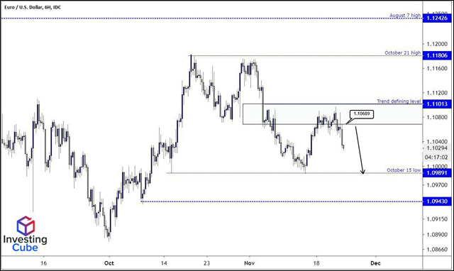 Dollar buyers have now dominion over the EURUSD pair, and the downtrend in the pair will remain intact as long as the price trades below the 1.11 level. The next support level in the pair is the October 15 low of 1.0989 and will probably act as a profit target level for bearish traders. Traders that are not already short will probably wait for a correction to the 1.1068 – 1.1100 level before adding to their bearish positions.