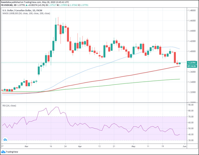 The USDCAD is 0.04% higher at 1.3757, making fresh 10-week lows earlier today as the correction from four-year highs continues. The correction accelerated after the pair breached below the 50-day moving average on May 18th and now positioning for a test of the 100-day moving average. The technical picture has improved for the short term below the 50-day moving average. However, the long term outlook remains bullish for USDCAD as long as the pair holds above the 100-day moving average.