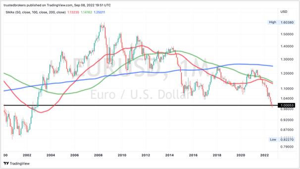 Technical analysis shows that there is remarkably little support around parity, beyond its symbolic importance. If EURUSD were to convincingly break below $1, some commentators suggest it could return to the $0.85 to $0.90 trading range it experienced between 2000 and 2002.