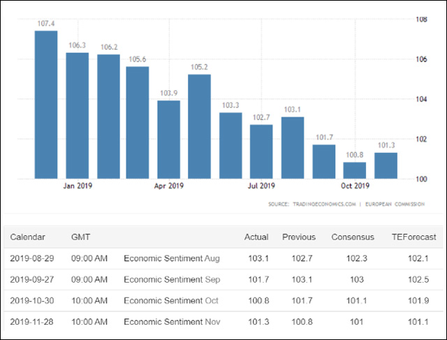 Nevertheless, according to European Commission, the Eurozone economic sentiment indicator rose 0.5 points from a month earlier to 101.3 in November 2019, beating market expectations of 101.0, boosted by improved confidence among manufacturers (-9.2 vs -9.5 in October), consumers (-7.2 vs -7.6), service providers (9.3 vs 9.0) and retailers (-0.2 vs -0.9). Meanwhile, morale among constructors deteriorated (3.1 vs 4.4). Economic Optimism Index in the Euro Area averaged 100.82 from 1985 until 2019, reaching an all time high of 118.10 in May of 2000 and a record low of 68.30 in March of 2009.