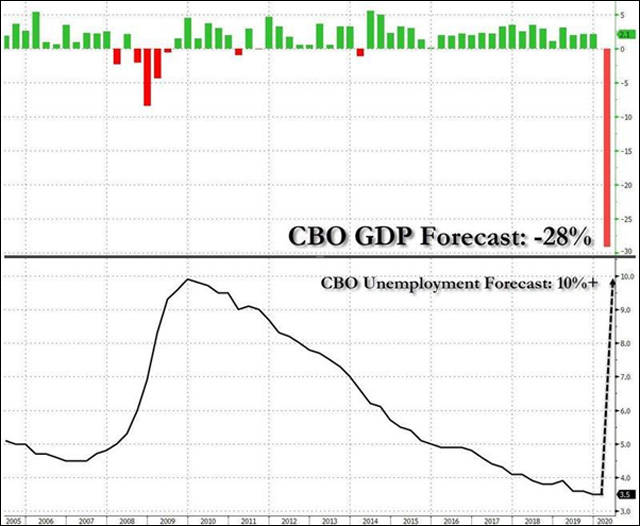 CBO (congressional budget office) expects the unemployment rate to exceed 10 percent during the second quarter, in part reflecting the 3.3 million new unemployment insurance claims reported on March 26 and the 6.6 million new claims reported this morning. (The number of new claims was about 10 times larger this morning than it had been in any single week during the recession from 2007 to 2009.)