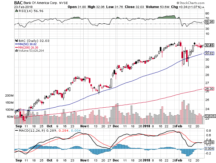 The above graphic indicates the nearly uninterrupted ascent of BAC over time. Note that Bank of America Corporation stock is currently trading at $32.03 per share, above its 50-day moving average of $30.82 per share, and significantly higher than its 200-day moving average of $26.30 per share. These are reflective of bullish price movements with this banking stock. If another interest rate is implemented in March, May, June, August, September, November, or December 2018, we can expect bank and financial stocks like BAC, WFC, C, MS, Visa, MasterCard to rally uninterrupted. While the performance of BAC has been exemplary over time, the same cannot be said of other companies like WFC which has been plagued by scandal over time. Nonetheless, the trend for this category of equities is bullish for 2018. The safe money is on call options, or outright purchases of stocks as a long-term, viable investment strategy.