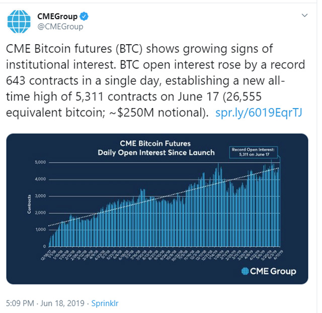 CME was the first to the institutional market with regulated cash-backed derivatives back in 2017 along with competitor Cboe. However, the latter dropped out of the market earlier this year, meaning CME was able to capitalize on the 2019 Bitcoin price highs in June.